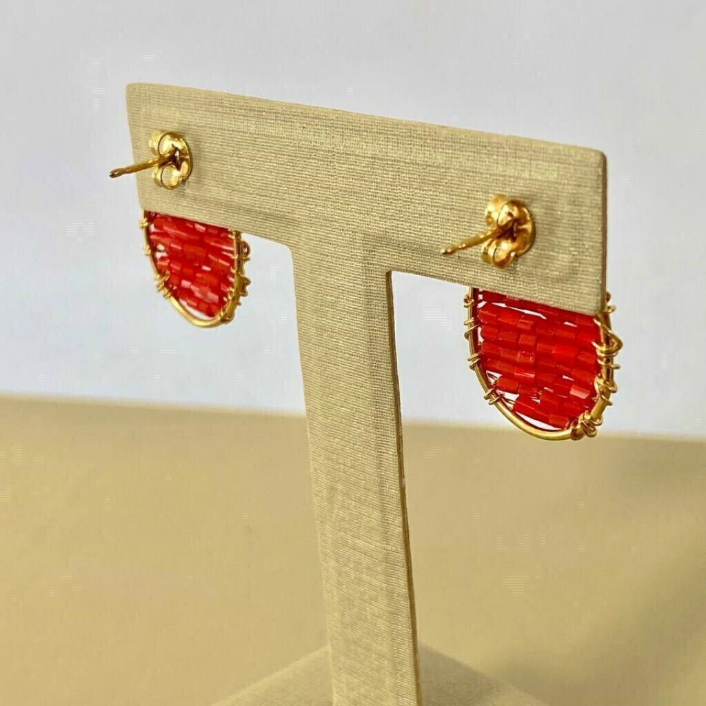 Brinco Artesanal Oval vermelho banhado a ouro 18k