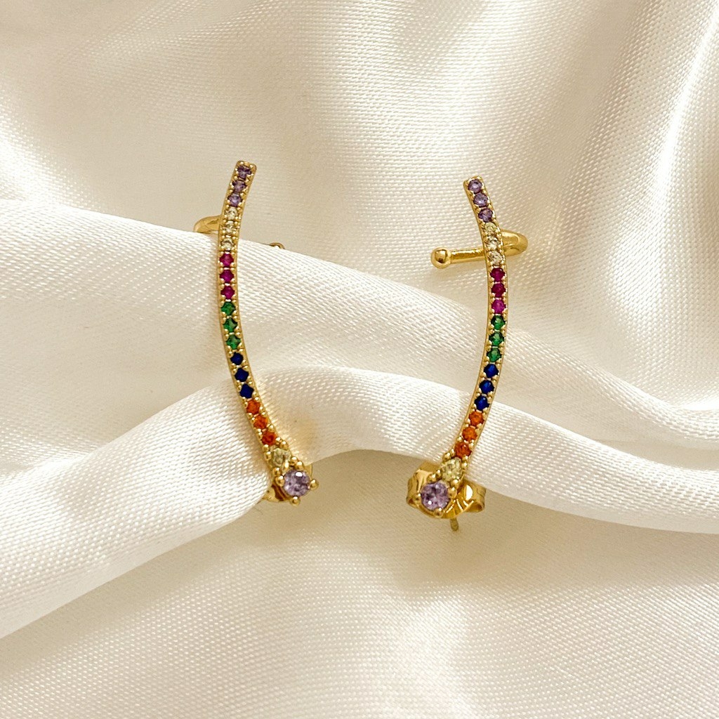 Brinco Ear Cuff cravejado em zircônias coloridas banhada em ouro 18k