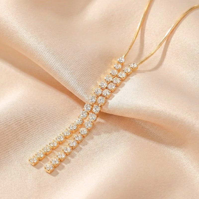 Delicado e sofisticado, o colar de dois fios com zircônia incolor banhado em ouro 18k cria um efeito elegante em camadas, valorizando o colo com brilho sutil. Uma peça versátil e atemporal, perfeita para usar sozinha ou em composições modernas e refinadas.