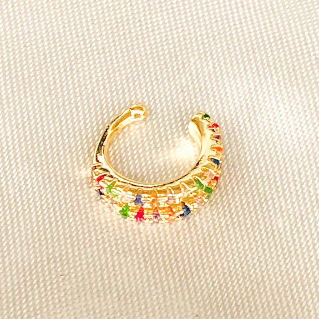 O piercing fake com zircônia colorida banhado a ouro 18k é uma peça vibrante e cheia de personalidade. Com um design que destaca zircônias em várias cores, ele traz um toque divertido e elegante ao visual. O acabamento em ouro 18k assegura durabilidade e um brilho luxuoso, tornando-o ideal para ocasiões especiais ou para dar um toque de cor ao dia a dia. Essa joia é perfeita para quem busca um acessório que combine estilo moderno e originalidade, sem a necessidade de perfuração.